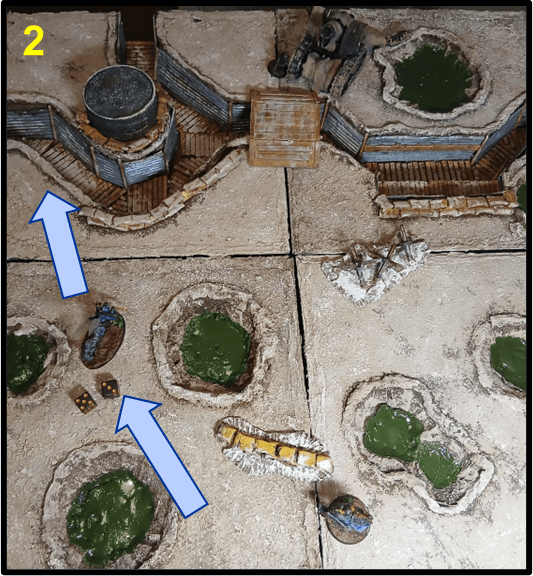 2) The Pit Locust activates, taking a Move ACTION to do a Standard Move, which automatically succeeds without the need to roll, and then successfully attempts a Dash ACTION to move a second time.