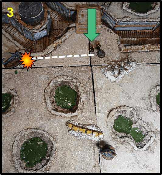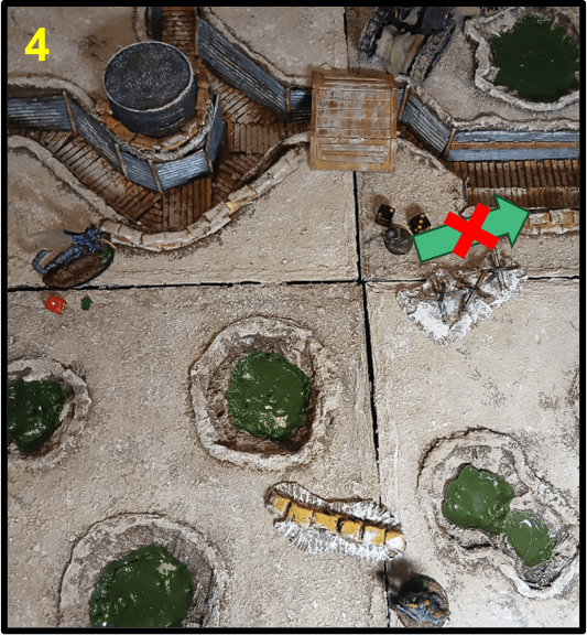 3) It’s the turn of brave Yeoman Geoff. He takes a Move ACTION to move into position, then makes a Ranged Attack with his Bolt-Action Rifle against the Pit Locust. He manages to hit his target, however the armour of the Locust is too hard to crack, and the shot doesn’t do damage.