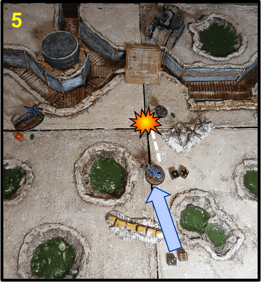 4) Next Geoff attempts to move back with a Dash ACTION, but he is unlucky, rolling only a 5. As Dash is a RISKY ACTION, the Yeoman’s activation is immediately over.