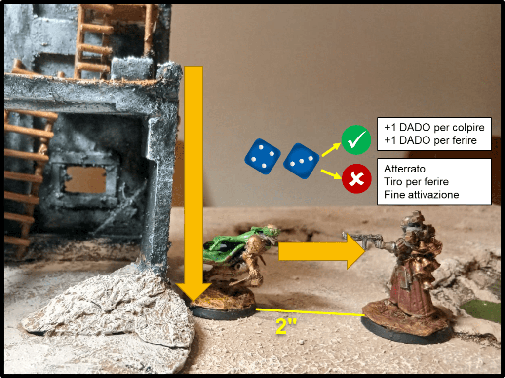 3) Nel turno successivo, l’Assassino vuole tornare al livello del suolo. Potrebbe scegliere di eseguire un’AZIONE RISCHIOSA per arrampicarsi verso il basso, ma sarebbe troppo lenta e, in caso di fallimento, sarebbe costretto a restare in cima all’edificio, per cui decide di saltare giù: in questo modo la distanza verticale non conterebbe nel movimento totale del modello. Tuttavia, poiché cade da un’altezza superiore ai 3″, è necessario un Tiro per Ferire, a cui si applica un modificatore di +1 DADO ( caduta di 3″ o più, ma meno di 6″) Il giocatore ottiene un 7, -1 per l’Armatura Standard indossata dall’Assassino diventa un 6: Ferita Minore!