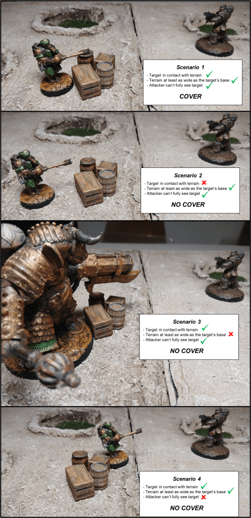 Cover: If the target is visible, but is in Cover, the attack roll suffers a -1 DICE penalty. In order to gain Cover a model must satisfy the following conditions.