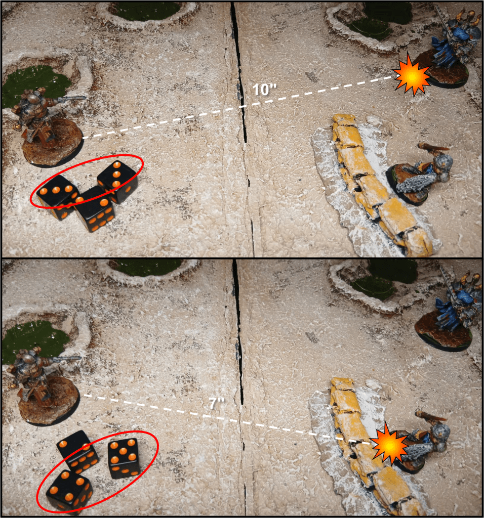 Posizione Sopraelevata: Un modello ottiene un bonus di +1 DADO al tiro di attacco se si trova su una superficie che è a 2″ o più di altezza rispetto alla superficie su cui è posizionato il bersaglio. Se il bersaglio è su una basetta da 50mm, invece, il modello attaccante deve trovarsi almeno 4″ sopra di esso per ottenere il bonus per la Posizione Sopraelevata.