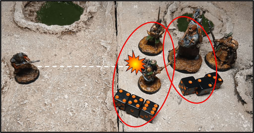 - Sparare in Mischia: Quando un modello esegue un Attacco a Distanza, può scegliere come bersaglio un nemico ingaggiato in un combattimento in Mischia. Tuttavia, dal momento che i modelli in mischia si muovono costantemente, non è detto che il bersaglio desiderato sia quello colpito: quando si spara in un combattimento in mischia, dopo aver scelto il bersaglio ma prima di tirare per colpire assegnate casualmente ciascun colpo ai modelli coinvolti nella mischia tirando 1d6 per ciascuno: con 1-3 il colpo è assegnato a un modello amico a caso entro 1″ dal bersaglio, mentre con 4-6 l’attacco colpisce un nemico a caso entro 1″ dal bersaglio (che potrebbe anche essere il bersaglio stesso).