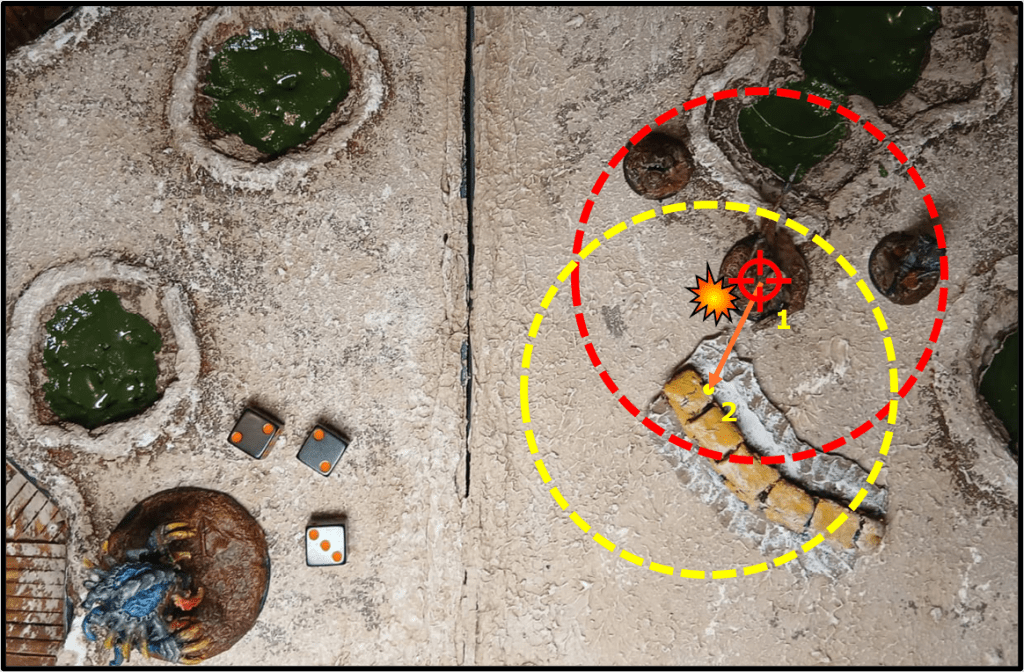 Se l’attacco colpisce, il proiettile atterra nel punto indicato. Solitamente questo tipo di attacchi ha la parola chiave ESPLOSIONE(X) per cui ogni modello, amico o nemico, entro X” dal punto è colpito, secondo le normali regole di ESPLOSIONE (per cui ad esempio i modelli non visibili dal centro dell’esplosione non sono colpiti). Se l’attacco manca, tuttavia, subirà una deviazione: l’avversario sceglie una direzione, e il punto di impatto si muove lungo quella direzione di un numero di pollici pari al “grado di fallimento” (cioè 7 – il risultato del tiro per colpire). Per esempio se il tiro di attacco è un 5, il punto di impatto devierà di 7 – 5 = 2 pollici dal punto indicato. Risolvi gli effetti dell’attacco considerando la nuova posizione come centro dell’ESPLOSIONE.