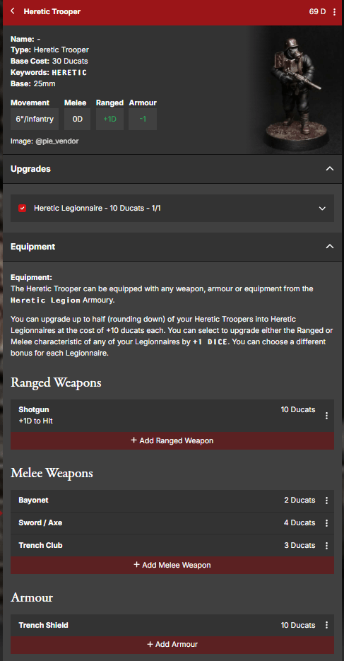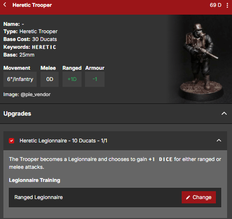 This Heretic Trooper has been upgraded to become a Legionnaire for an additional cost of 10 ducats. The Warband Builder allows you to select either the ranged or the melee bonus via a pop-up menu (by clicking on the “Change” button. In this case we selected the “Ranged” option that we see reflected in the model’s profile above.