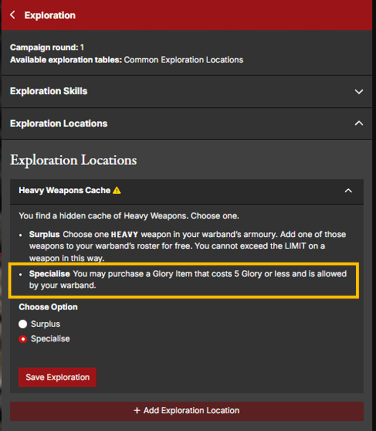 In order to acquire a Campaign Glory Item you first need to go on the “Exploration” menu and select an exploration location that allows you to purchase Glory Items. After you click on the “Save Exploration” button, you’ll be able to select which item to purchase from the Exploration menu.