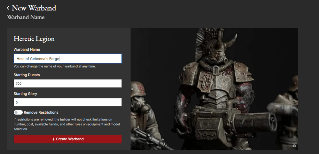 Let’s say we want to build a starting campaign warband. 700 ducats and 0 glory points are set as default values, we just need to choose a cool name for our warband and click “Create Warband”.