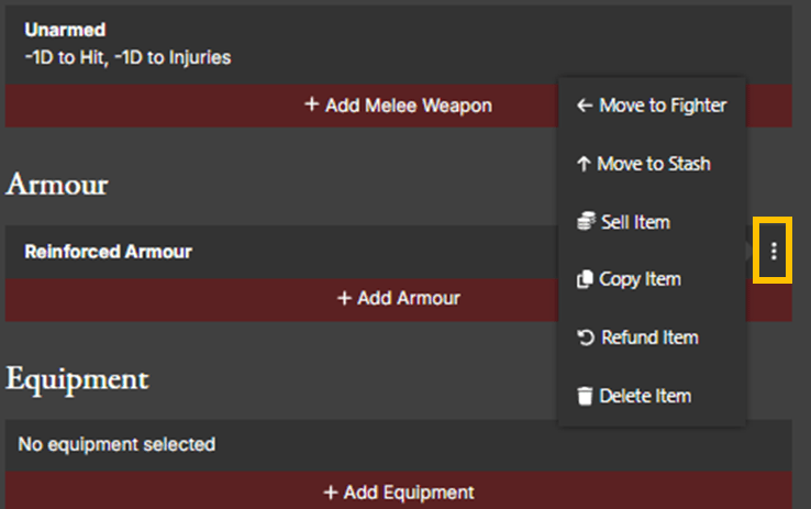 When clicking on the “three bullets” icon right to an item, an actions menu will appear. Here you can move the item to another model or to the warband’s paychest (stash), purchase another copy of the item, or remove the item, with one of the three options listed