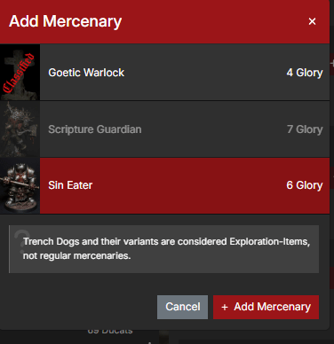 You can add a Mercenary to your roster by clicking on the “Add Mercenary” button at the bottom of the warband’s list and then select an available Mercenary from the menu, as you would do for regular troops.