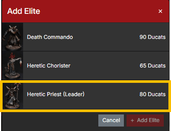 The Warband Builder notifies us we still need a Leader, and the mandatory Heretic Priest is not present. Let’s fix that! Click on “Add Elite” to select an Elite model to add.