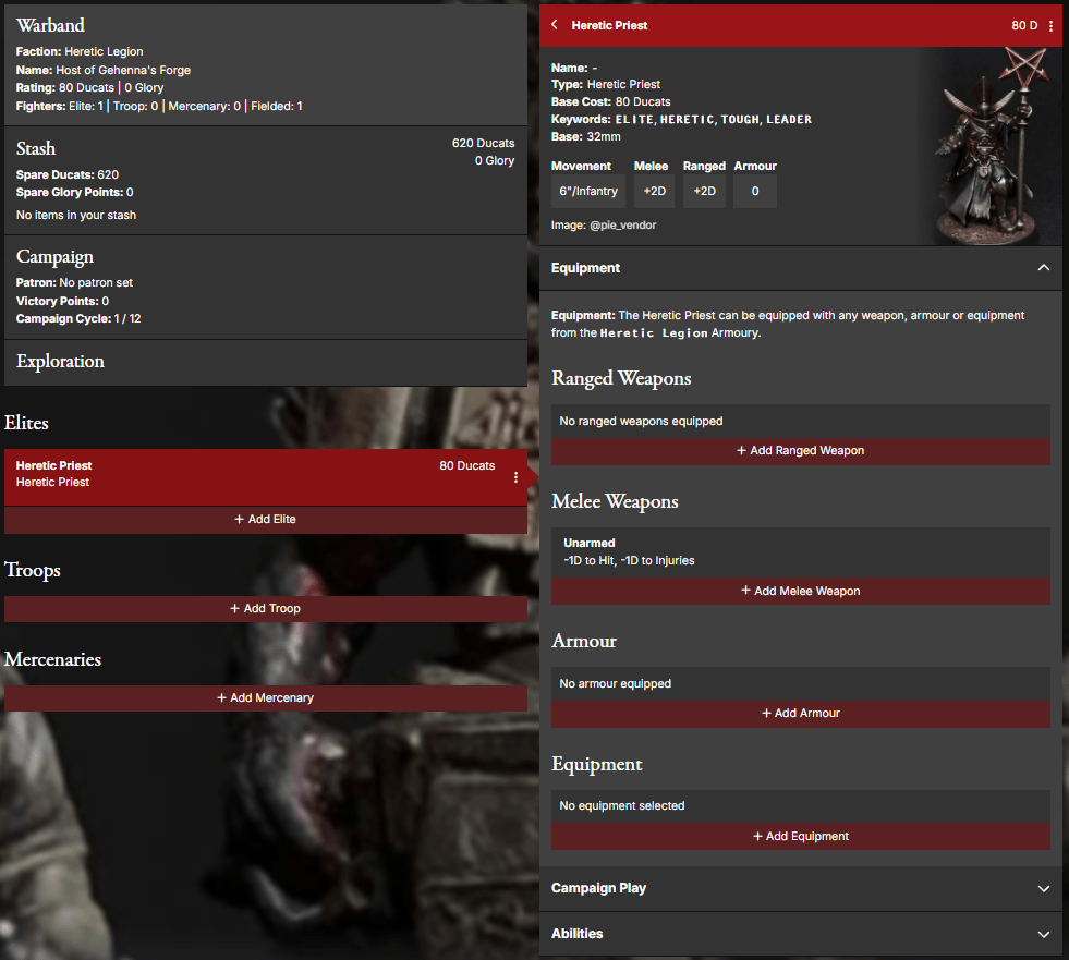 We’ve added a Heretic Priest to the warband. You’ll notice the warnings disappeared. By clicking on the Heretic Priest card on the left, an information panel opens on the right, showing the model profile, equipment selections, campaign play information (experience, skill advancements, traumas and scars) and model’s abilities.