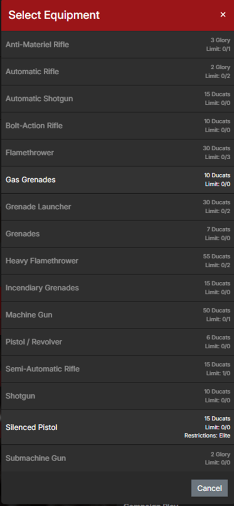 Let’s start equipping our Heretic Priest. Click on “Add Ranged Weapon” in the Priest’s panel to open the weapon selection menu. You’ll notice some options will be grayed out. This is because the model cannot choose those options, either because it doesn’t satisfy the requirements the limit for that item has been exceeded, or you don’t have enough ducats or – like in this case – Glory to purchase the item. With a Ranged and a Melee characteristic of +2 DICE, we want our Priest to be flexible, so we select a Semi-Automatic Rifle that allows it to shoot at a pretty long distance and also charge thanks to ASSAULT. To equip the model, we click onto “Add Equipment”