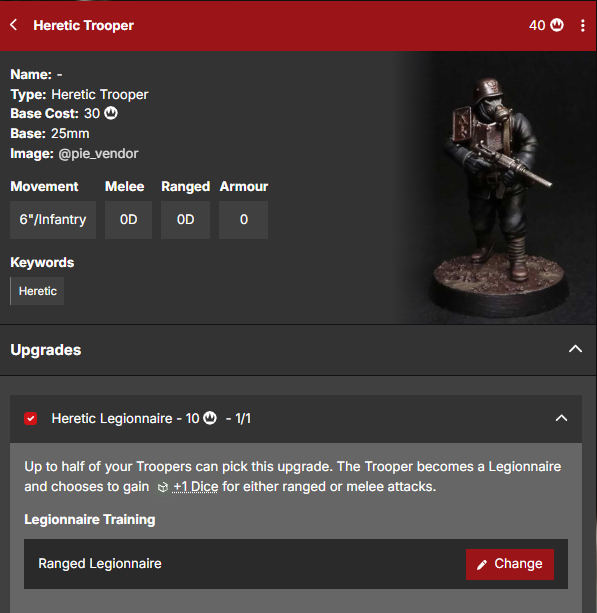 Abbiamo un budget, e abbiamo scelto la fazione, è finalmente ora di iniziare a creare la nostra lista. Ogni fazione offre un elenco di modelli tra cui scegliere, con dettagli su: