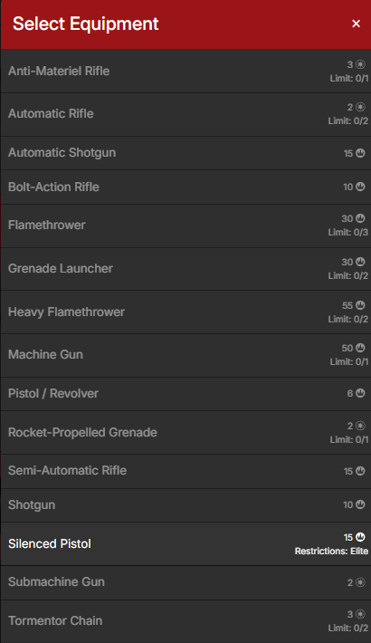 - Se un oggetto ha delle restrizioni (es. “Solo ELITE” o “solo Commando della Morte”), solamente i modelli del tipo indicato possono averlo;