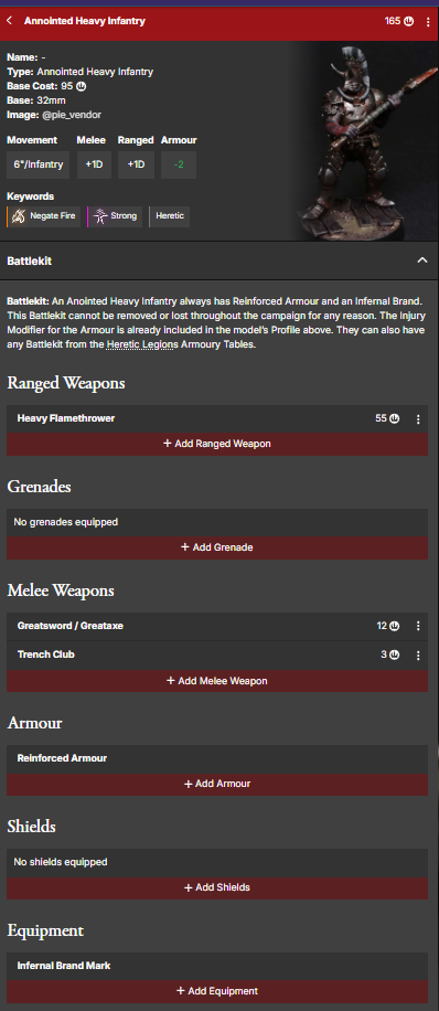 Notare inoltre che il Consacrato ha alcuni pezzi di equipaggiamento predeterminati (Armatura Rinforzata e Marchio Infernale) che non hanno indicato un costo in quanto già considerati nel valore totale del modello e che non possono essere rimossi o modificati.