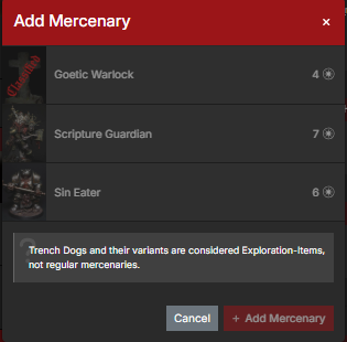 I Mercenari sono specialisti che potrete aggiungere alla vostra banda. Potete avere più mercenari nella formazione, ma non più di una copia di ciascuno. Le regole di ciascun mercenario indicheranno quali fazioni possono reclutarli. Hanno il loro equipaggiamento (che non può essere modificato) e le proprie regole, ma non beneficiano delle regole speciali della vostra fazione o variante (come ad esempio il +1 DADO ai tiri di Scatto delle Forze d’Assalto Navali Eretiche o la regola Attacco Concentrato di Nuova Antiochia). Per tutti gli altri versi, funzionano esattamente come un qualsiasi altro modello nella vostra banda.