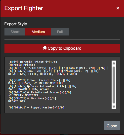 A questo punto dovreste avere tutti gli strumenti che vi servono per iniziare ad assemblare la vostra prima Banda da Guerra. Quando l’avrete fatto, vorrete probabilmente stampare la vostra lista per giocare o condividerla con i vostri amici. Trench Companion vi offre alcune opzioni.