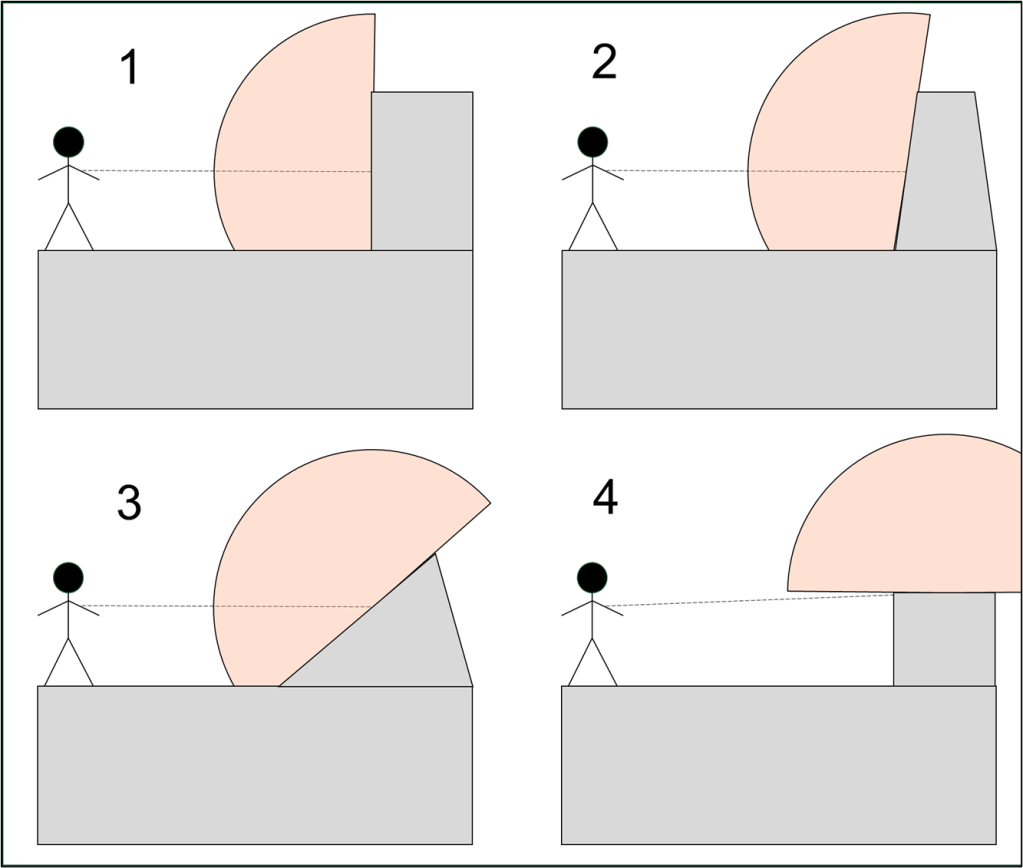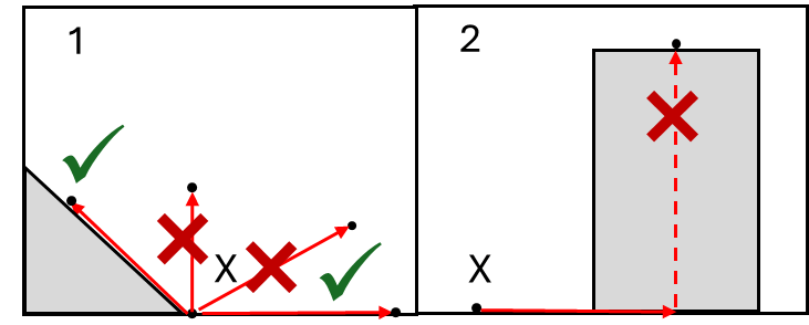A: Here consensus is split between an interpretation of “a point on the battlefield” being a point on any surface, including vertical (so in the example below, all are viable scenarios) and a more conservative solution, less adherent to rules-as-written, according to which the target point must be on a surface a model is able to stand upon (cases 3 or 4 in the example below). Feel free to adopt the solution you prefer, as long as you and your opponent agree. (?)