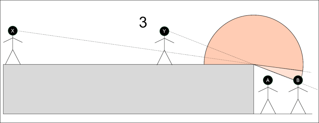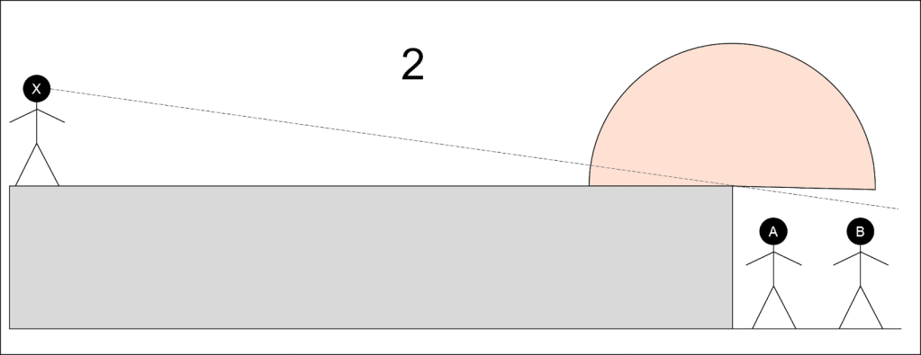 A: The most agreed upon interpretation is that the point is on the horizontal surface, so anything that is below that level is not visible and not hit by the BLAST (see example 2 below). Scenario 1, where the point is exactly on the edge and allows models in the trench to be caught in the BLAST is generally deemed not being the best solution as it nullifies the protection provided by terrain. A potential solution (example 3) has been proposed to allow a BLAST to hit models that are in Line of Sight of the attacker, but those models could also be directly targeted by the attack. (?)