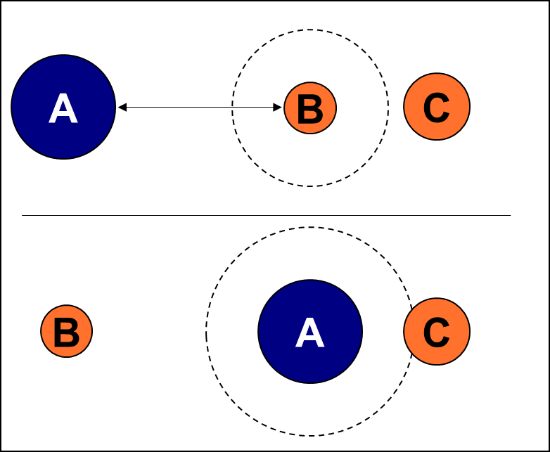 4) A cannot charge C, because doing so would have it pass within 1” of B. As the charge must be along the shortest route possible, A cannot choose to move to the side to avoid B. In this situation A must either charge B or not charge at all.