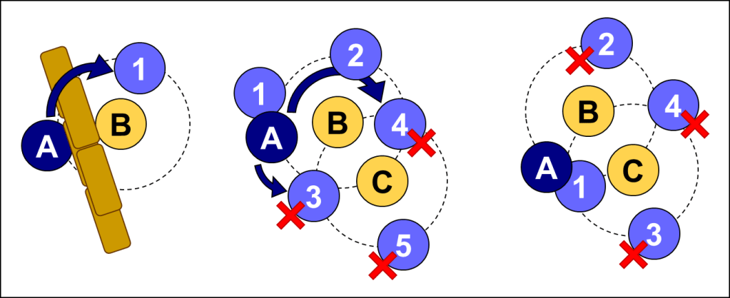 Right: Here A is within 1” of both B and C, so its movement capabilities are very limited. It cannot get to position 2 or 3 as it would leave the 1” range from one of the enemies, but it also can’t get to 4, as it must remain within 1” of both enemies throughout the entire move, and it has no room to pass between them.